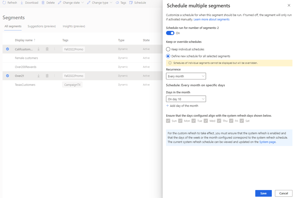 I segmenti possono essere aggiornati in base all'aggiornamento pianificato del sistema, settimanale, mensile o aggiornato manualmente su richiesta. Il valore predefinito è ogni aggiornamento pianificato del sistema. Potresti voler pianificare i segmenti della stagione precedente o i segmenti che non cambiano spesso con una cadenza più lenta, ad esempio mensile, affinché i segmenti più importanti si aggiornino più rapidamente.