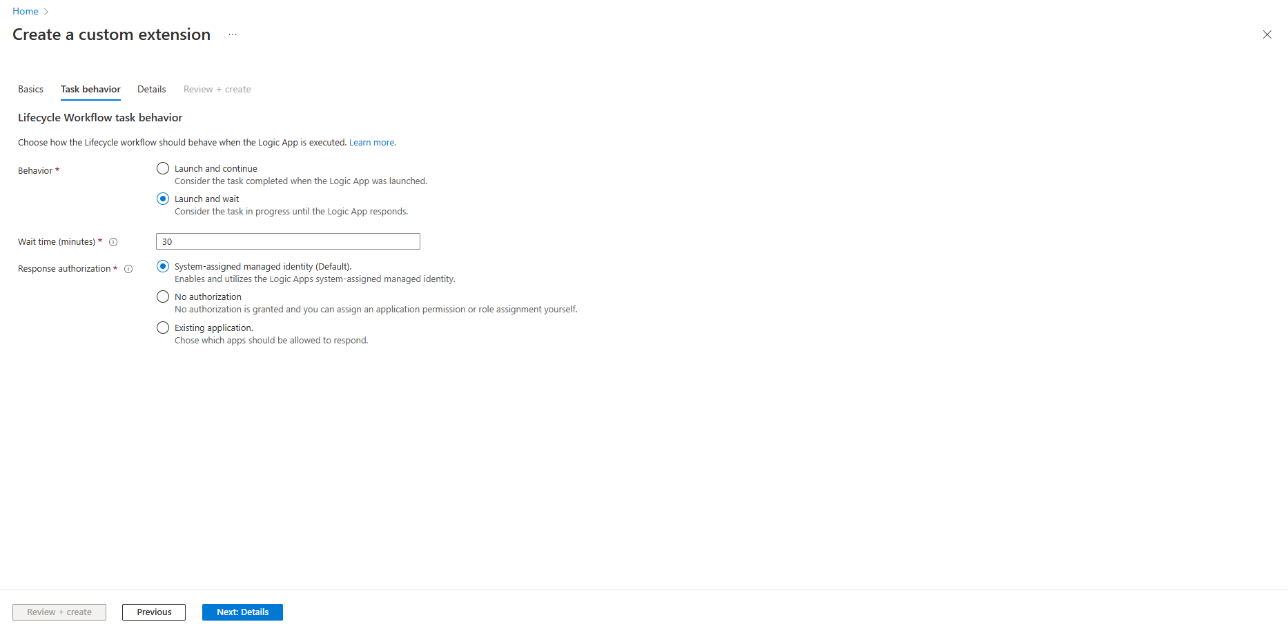 Se si seleziona Avvia e si attende, viene fornita l'opzione di decidere quanto tempo attendere una risposta dall'app logica prima che l'attività sia considerata un fallimento, oltre a opzioni per impostare Autorizzazione risposta. Dopo aver scelto queste opzioni, sarà possibile selezionare Avanti: Dettagli.