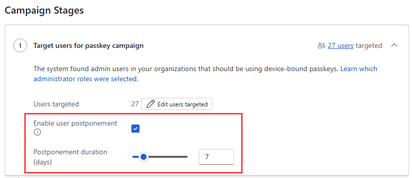 Dopo aver abilitato questa impostazione, l'agente inizia ad analizzare il tenant per identificare gli utenti idonei per una campagna passkey. Attualmente, l'agente è destinato agli utenti con privilegi di amministratore per impostazione predefinita. Per altre informazioni, vedere Ruoli di amministratore supportati.