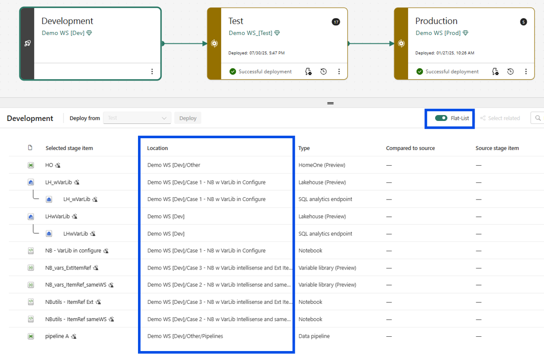 La visualizzazione dell'elenco piatto è una funzionalità aggiuntiva delle pipeline di distribuzione che consente di selezionare gli elementi indipendentemente dalla loro posizione. Con la visualizzazione elenco flat, è ora possibile selezionare gli elementi tra le cartelle, per quanto riguarda la posizione nell'area di lavoro.