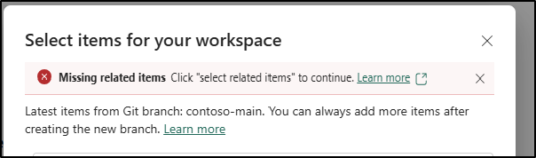Quando si esegue la diramazione selettiva, sono necessarie tutte le dipendenze dell'elemento. A tale scopo, è possibile usare il pulsante Seleziona elementi correlati . Se non si seleziona una delle dipendenze, viene visualizzato quanto segue: