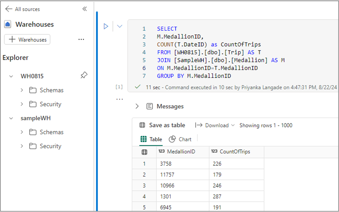 È possibile eseguire query tra magazzini utilizzando la denominazione a tre parti. La denominazione in tre parti è costituita dal nome del database, dal nome dello schema e dal nome della tabella. Il nome del database è il nome del warehouse o dell'endpoint di analisi SQL, il nome dello schema è il nome dello schema e il nome della tabella è il nome della tabella.
