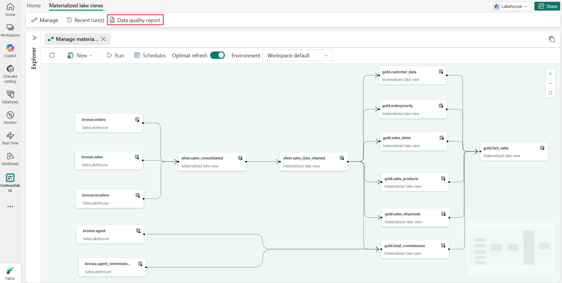 Nella pagina Gestione viste materializzate del lago, selezionare Report qualità dei dati.