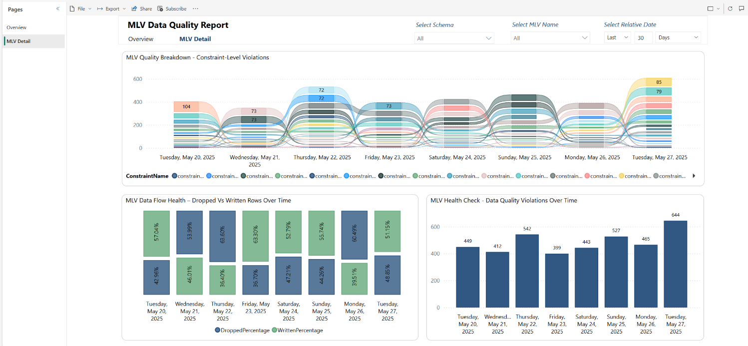 La pagina Dettagli MLV del report sulla qualità dei dati mostra le metriche relative alla qualità dei dati con una granularità più profonda rispetto alle visualizzazioni aggregate. È possibile filtrare per una vista lake materializzata specifica ed estendersi oltre una settimana modificando SchemaName, MLVNamee RelativeDate nei filtri del report.