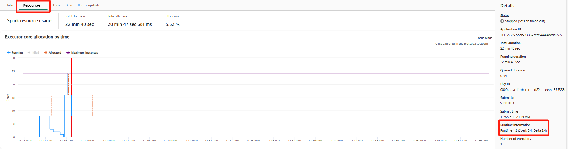 Il grafico dell'utilizzo delle risorse è interattivo. Quando si passa il puntatore del mouse sul grafico dei core degli executor in esecuzione, verrà visualizzato un riepilogo dei core e delle informazioni degli executor corrispondenti. Facendo clic su un punto nella linea centrale dell'executor in esecuzione verranno visualizzate informazioni dettagliate sul rispettivo executor e sul lavoro in quel momento specifico, mostrate nella parte inferiore del grafico.