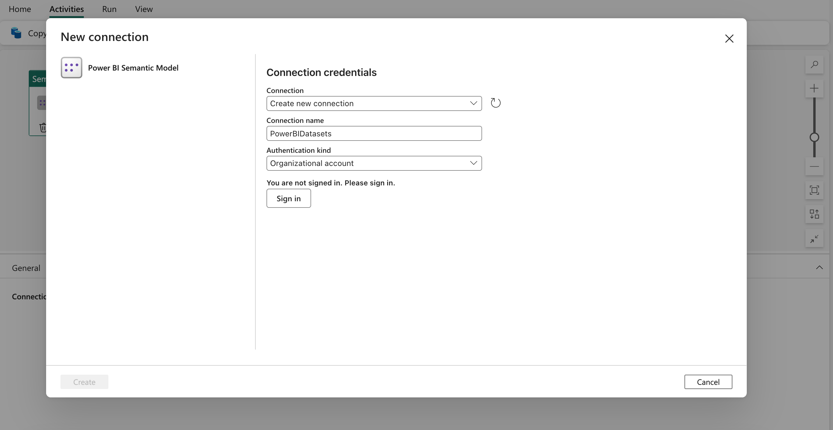 Prima di aggiungere l'attività di aggiornamento del modello semantico, assicurarsi di avere una connessione ai set di dati Power BI.