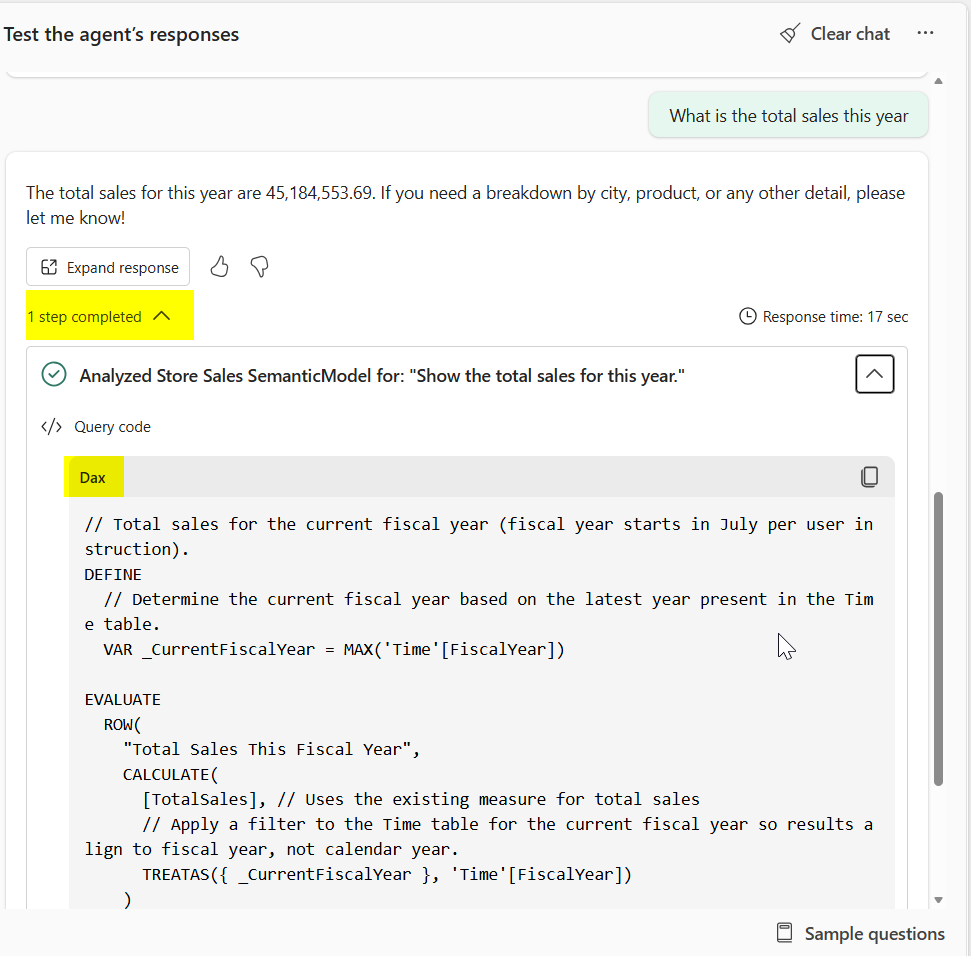 Verificare e testare DAX: L'accuratezza della risposta dipende dalla query DAX generata. Quando testi il tuo agente dati, esamina la query DAX in ciascuna risposta per verificare che sia valida e risponda correttamente alla domanda. Se i risultati non sono corretti, analizzare il DAX per identificare le configurazioni (modello semantico, schema dei dati di intelligenza artificiale, risposte verificate o istruzioni di intelligenza artificiale) devono essere rettificate.