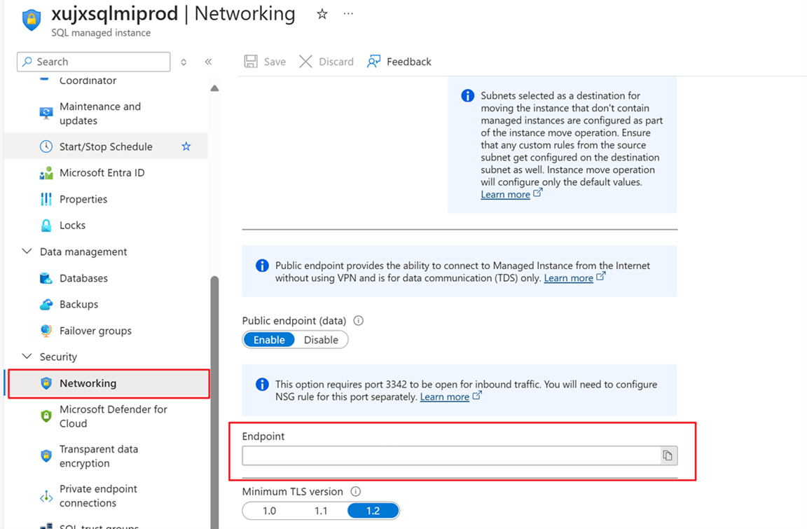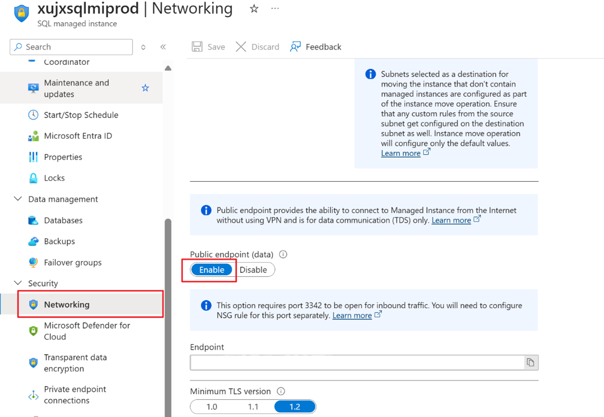 Passare al portale di Azure, aprire l'istanza gestita di Azure SQL, selezionare Rete e abilitare l'endpoint pubblico.