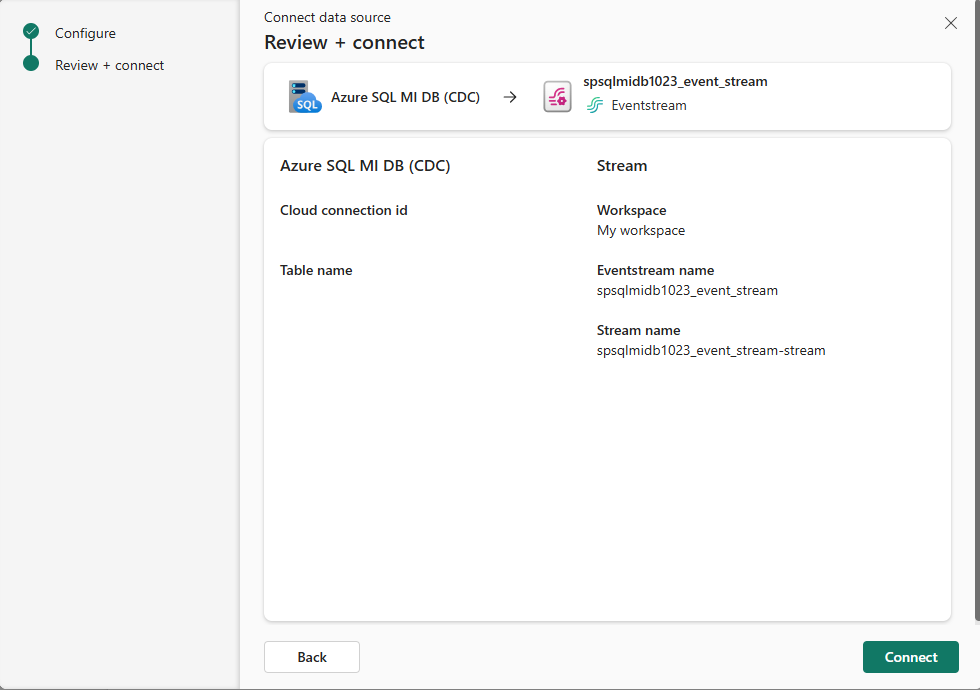 - Nella pagina Rivedi e connetti, se si seleziona Apri eventstream, la procedura guidata apre il flusso di eventi, creato per te con l'istanza selezionata di Azure SQL MI DB CDC come origine. Per chiudere la procedura guidata, selezionare Chiudi o X* nell'angolo superiore destro della pagina.