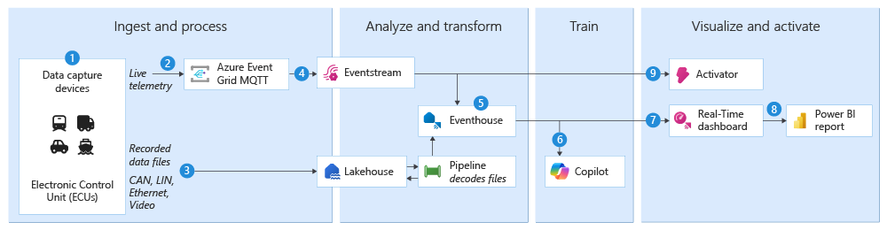 L'architettura di riferimento della flotta connessa usa Microsoft Fabric Real-Time Intelligence per creare una piattaforma di analisi unificata che elabora i dati di telemetria dei veicoli in tempo reale e consente la gestione intelligente della flotta. È possibile implementare l'architettura con quattro fasi operative principali: inserimento e processo, analisi, trasformazione e arricchimento, training e visualizzazione e attivazione.
