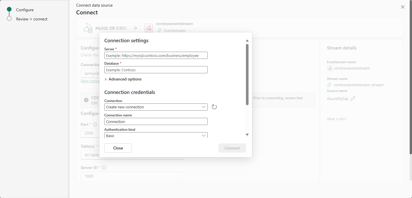 È possibile espandere Impostazioni avanzate per accedere ad altre opzioni di configurazione per l'origine CDC del database MySQL: