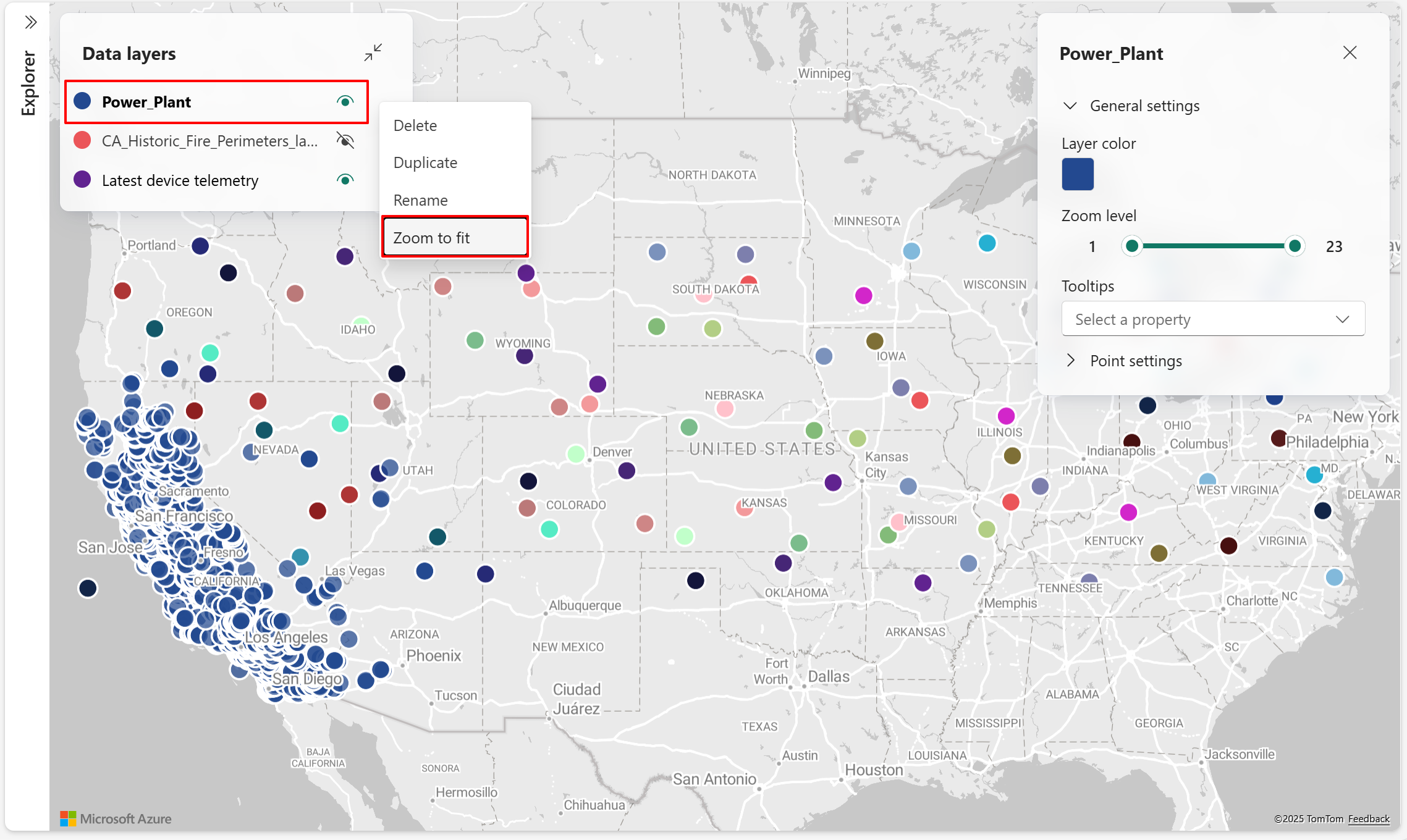 Lo screenshot seguente illustra come riordinare i livelli di dati. Per migliorare la chiarezza visiva nelle aree sovrapposte, spostare il livello Power Plant nella posizione superiore della mappa. L'inserimento di livelli basati su punti sopra i livelli poligoni rende più facili da vedere e interpretare le caratteristiche sovrapposte.