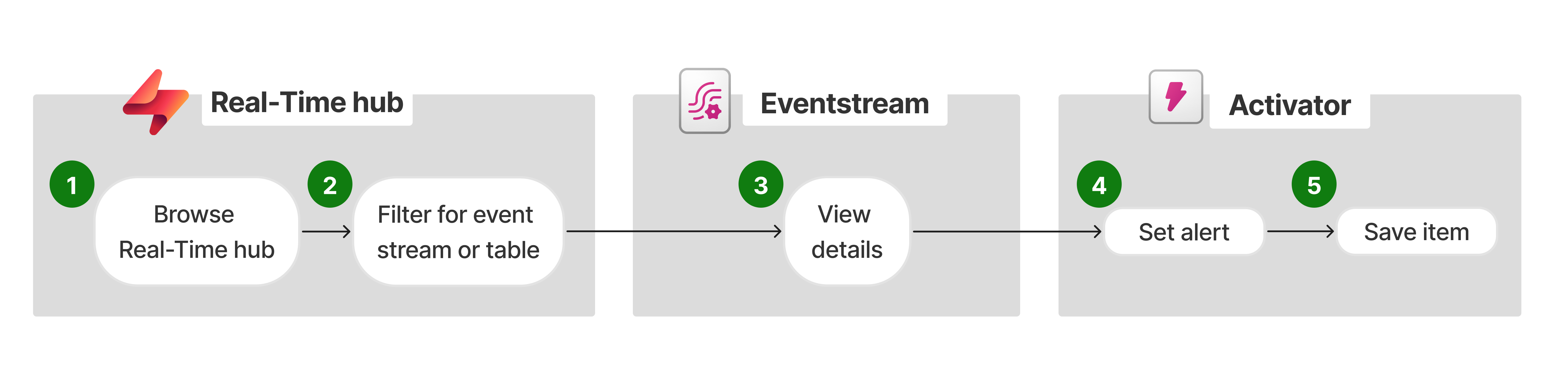 L'hub in tempo reale viene usato per individuare e gestire i dati di streaming in Fabric. È possibile eseguire ricerche in un catalogo di flussi di dati in esecuzione attiva in Fabric, scegliere un flusso desiderato e reagire a questi dati impostando gli avvisi.