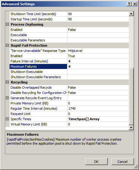 failureElement.Properties.Item("rapidFailProtectionMaxCrashes").Value = 5