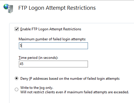 appcmd.exe set config  -section:system.ftpServer/security/authentication /denyByFailure.enabled:"True" /denyByFailure.maxFailure:"10" /denyByFailure.entryExpiration:"00:00:35" /denyByFailure.loggingOnlyMode:"False"  /commit:apphost