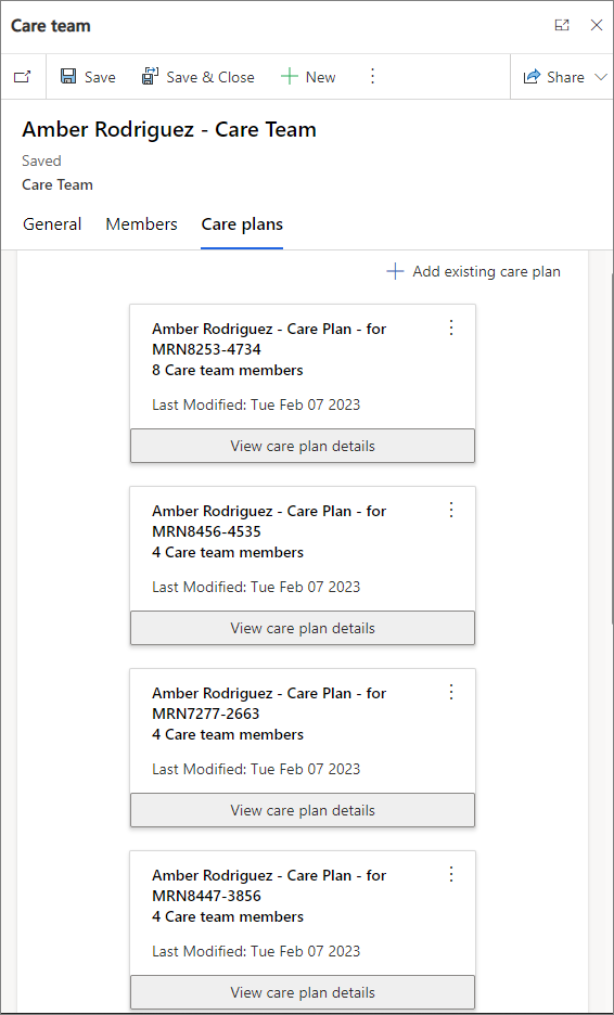 Informazioni sul piano di assistenza: dettagli di ogni piano di assistenza associato al paziente e collegamenti ai rispettivi piani di assistenza. È anche possibile aggiungere o rimuovere piani di assistenza esistenti dallo stesso riquadro.