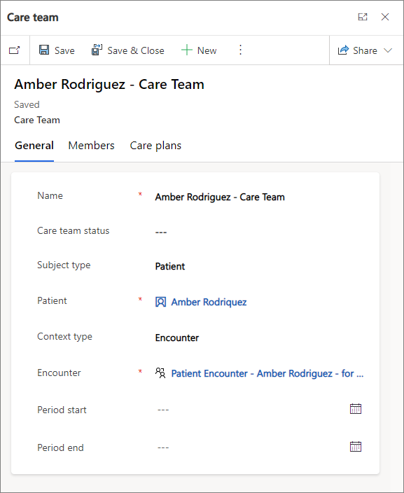 Informazioni generali: nome del team di assistenza, stato del team di assistenza, nome e dettagli del paziente, tipo di contesto (incontro o episodio di cura), elenco di incontri o episodi di assistenza, inizio e ora di fine del periodo di assistenza.