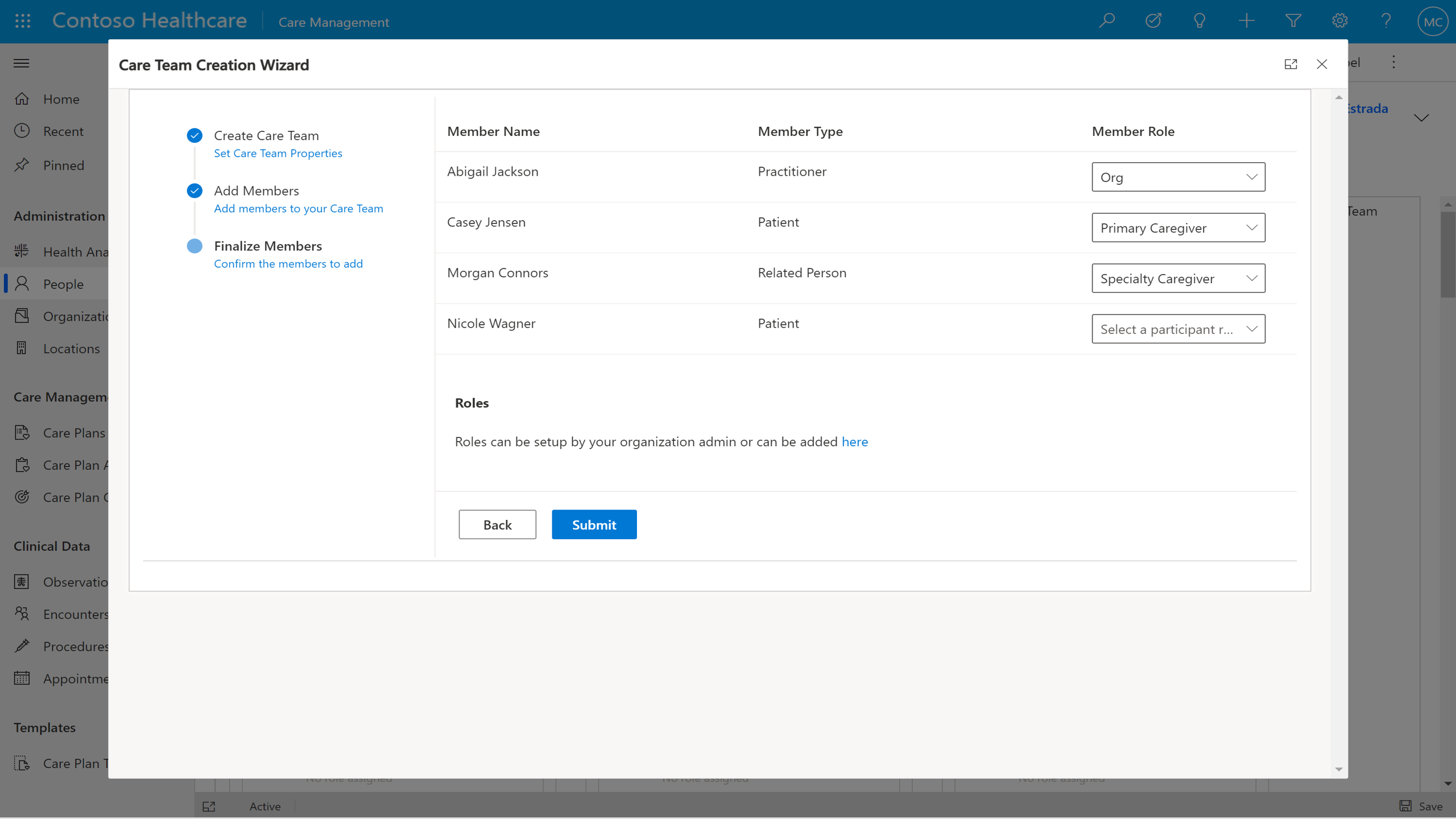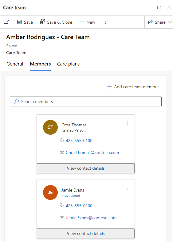 Selezionare la scheda Team di assistenza per una visualizzazione dei professionisti medici, dei familiari e di altre persone autorizzate coinvolte nell'assistenza del paziente, inclusi i nomi, il ruolo del team di assistenza e il piano di assistenza e la condizione associati.