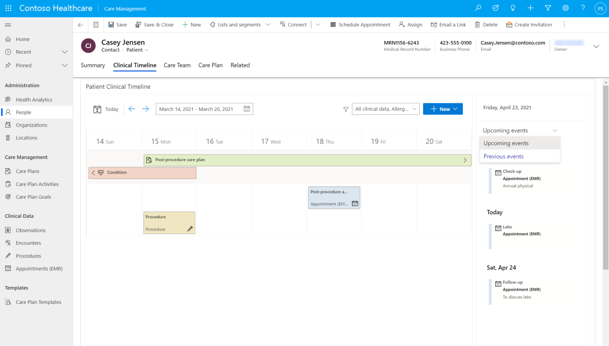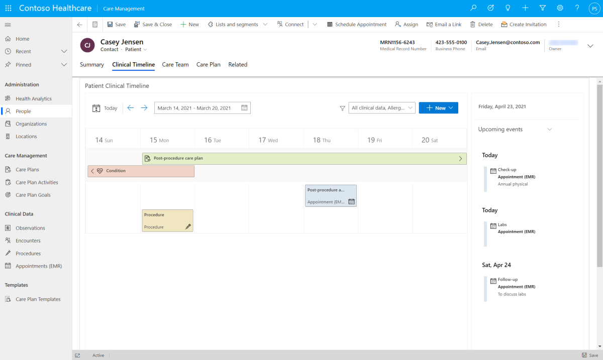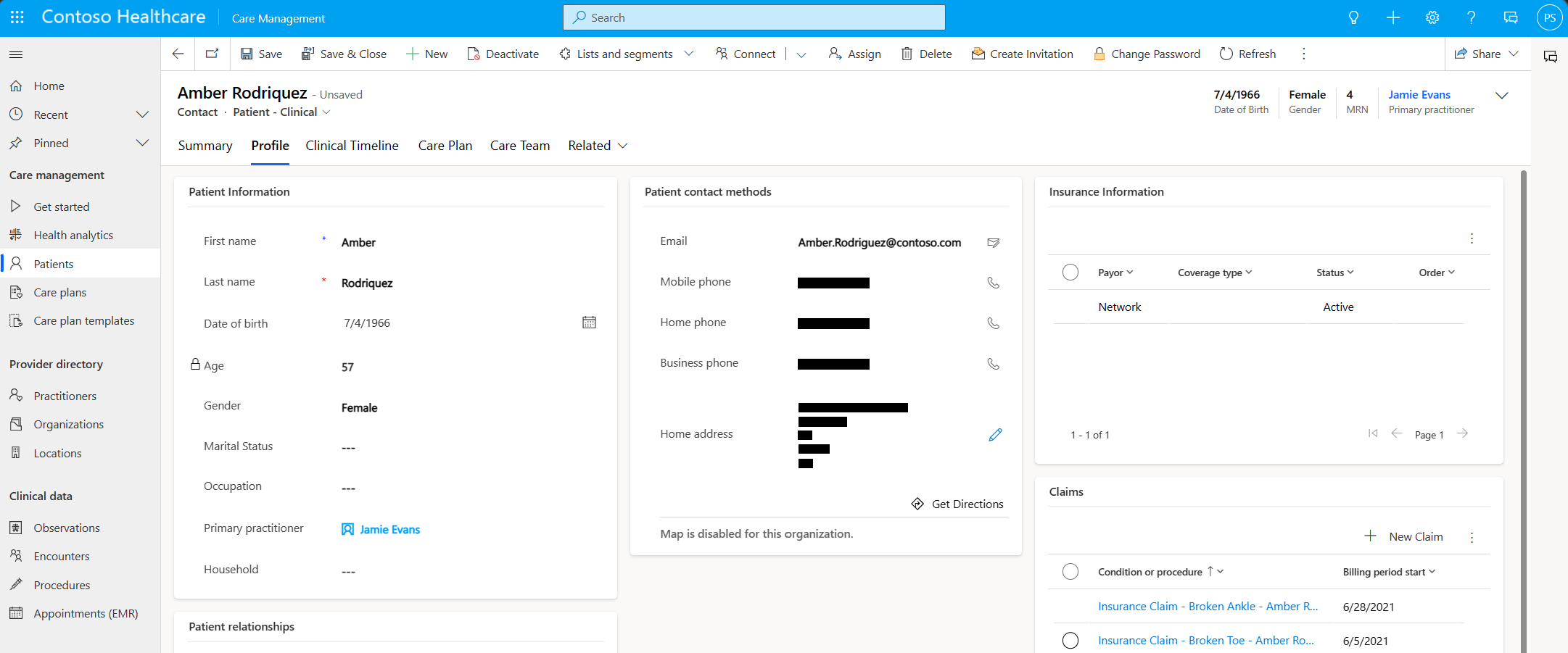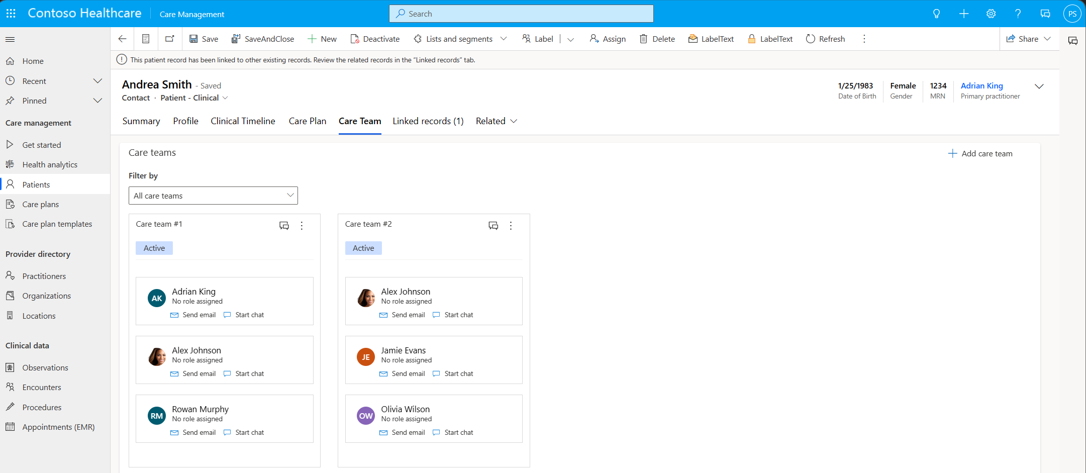 La visualizzazione unificata dei pazienti visualizza i dati dei pazienti nelle app basate su modello Dynamics, incluse le informazioni demografiche e i dati clinici. Include anche la sequenza temporale clinica e i controlli del team di assistenza.
