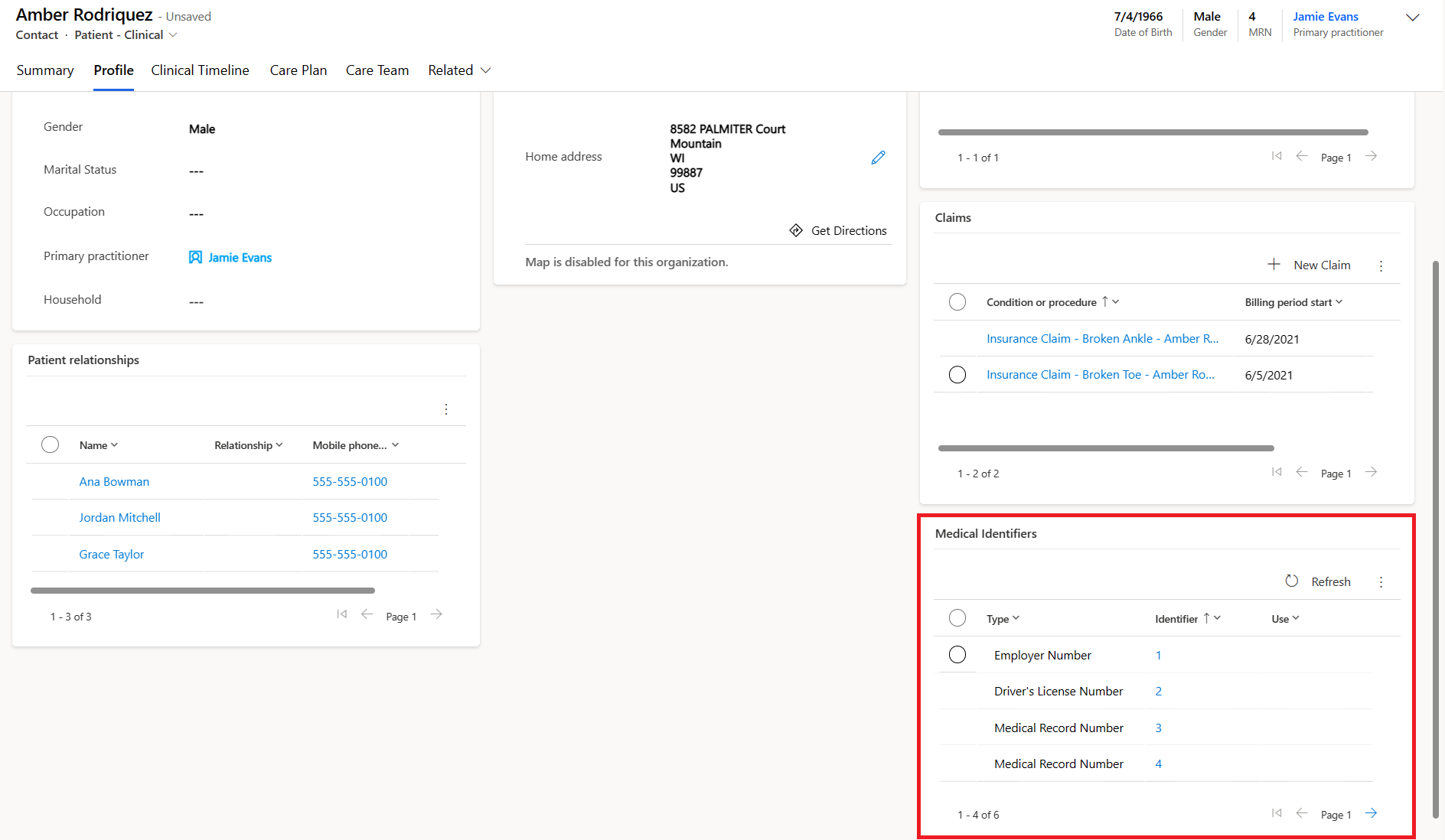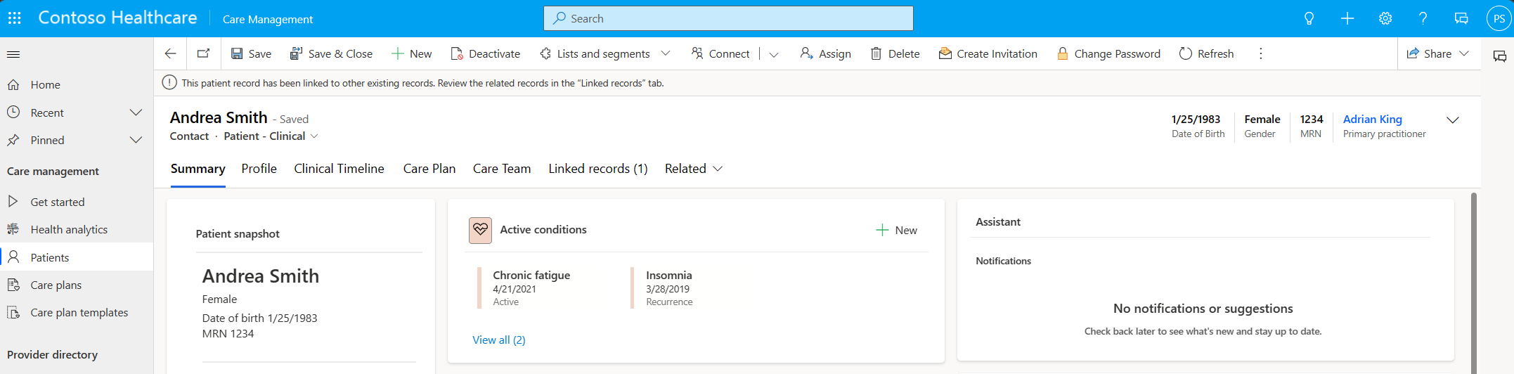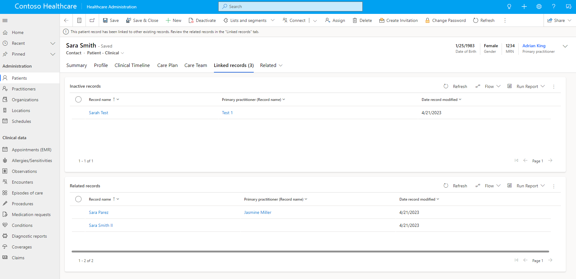 Si consideri, ad esempio, uno scenario in cui Olivia Wilson è il record primario e Olivia James è un record collegato per questo record primario. Quando un utente seleziona il record collegato Olivia James e viene reindirizzato al record primario Olivia Wilson, viene visualizzato il seguente messaggio all'utente: "Sei stato reindirizzato qui perché questo record del paziente è diventato il record principale per Olivia James".