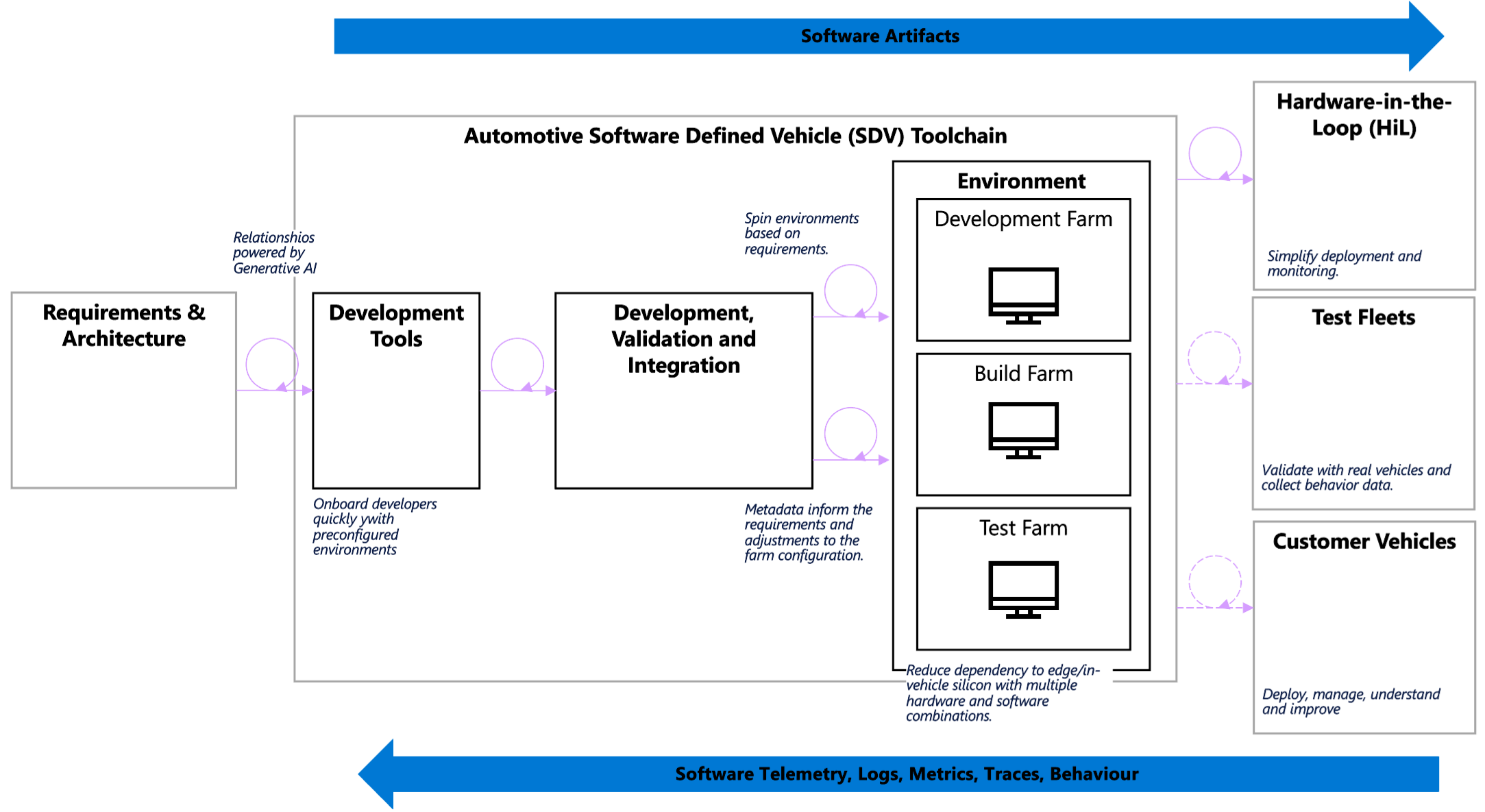 The reference architecture leverages our developer and DevOps assets to create a flexible and composable toolchain that allows developers to quickly and efficiently test and validate software against virtual ECUs and HPCs in the cloud. Further, the toolchain helps developers to deploy their solutions in hardware-in-the-loop and validation fleets.