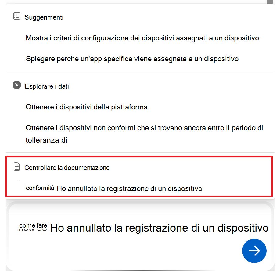 Usando il linguaggio naturale, è possibile eseguire query ed esplorare i dati Intune, inclusi i dati relativi a dispositivi, utenti, app, criteri, aggiornamenti e conformità. Sono inoltre disponibili esempi predefiniti che consentono di comprendere i tipi di domande che è possibile porre.