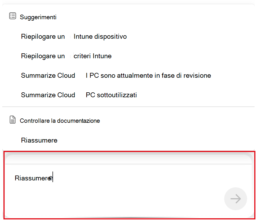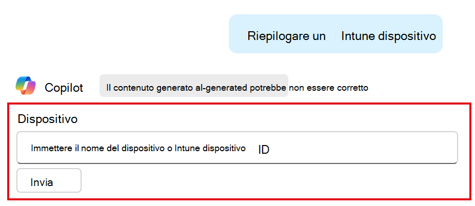Se una richiesta richiede altre informazioni, viene richiesto di immettere tali informazioni. Ad esempio, se si seleziona il suggerimento Riepiloga un dispositivo Intune, viene richiesto di immettere l'ID dispositivo: