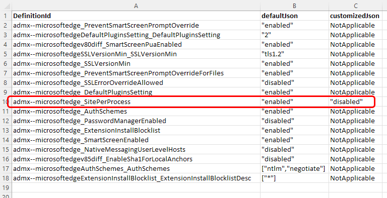 La schermata seguente mostra un'esportazione per il profilo Microsoft Edge versione 85, come visualizzato in Microsoft Excel. Delle nuove impostazioni delle baseline di Microsoft Edge 17 trovate nel profilo precedente, viene modificata una sola impostazione: Abilita l'isolamento del sito per ogni sito è stato impostato su Disabilitato nella baseline precedente. Nella baseline più nuova l'impostazione predefinita è Abilitata: