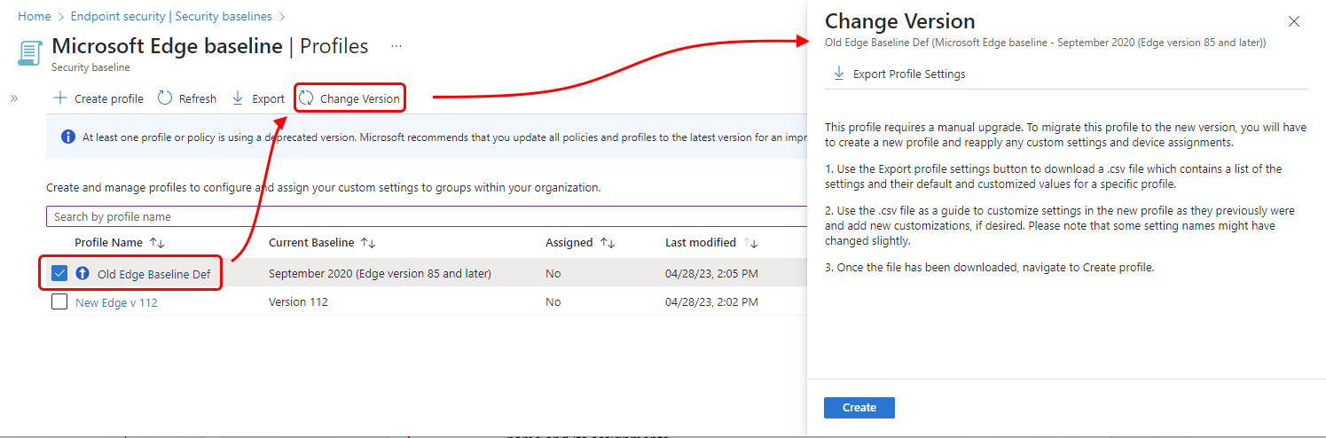 Nel riquadro Modifica versione sono disponibili istruzioni per spostare i dettagli di configurazione dalla baseline precedente a un profilo che usa il nuovo formato. Il riquadro identifica anche il nome e la versione delle linee di base selezionate e la versione della baseline più recente.
