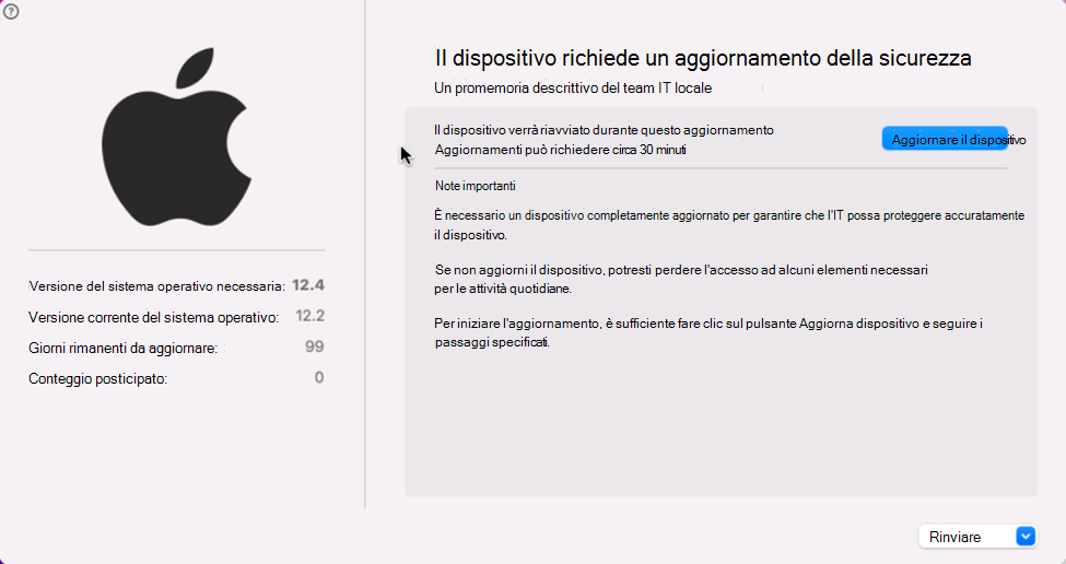 Uno strumento comune all'interno della community di amministrazione di Microsoft macOS è Nudge. Nudge è uno strumento della community open source che incoraggia gli utenti finali a installare gli aggiornamenti macOS. Offre un'esperienza di configurazione avanzata per gli amministratori.
