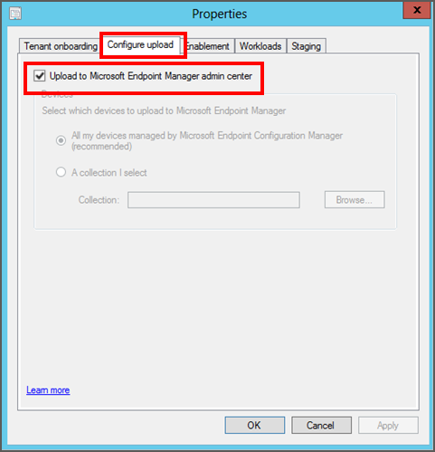 L'impostazione predefinita per il caricamento del dispositivo è Tutti i miei dispositivi gestiti da Microsoft Endpoint Configuration Manager. È anche possibile scegliere di limitare la configurazione a una o poche raccolte di dispositivi.