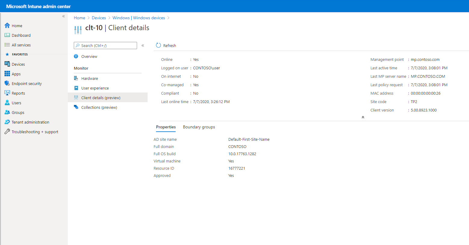 È possibile visualizzare Gestione configurazione dettagli del client, tra cui raccolte, appartenenza a gruppi di limiti e informazioni client per un dispositivo specifico nell'interfaccia di amministrazione Microsoft Intune.