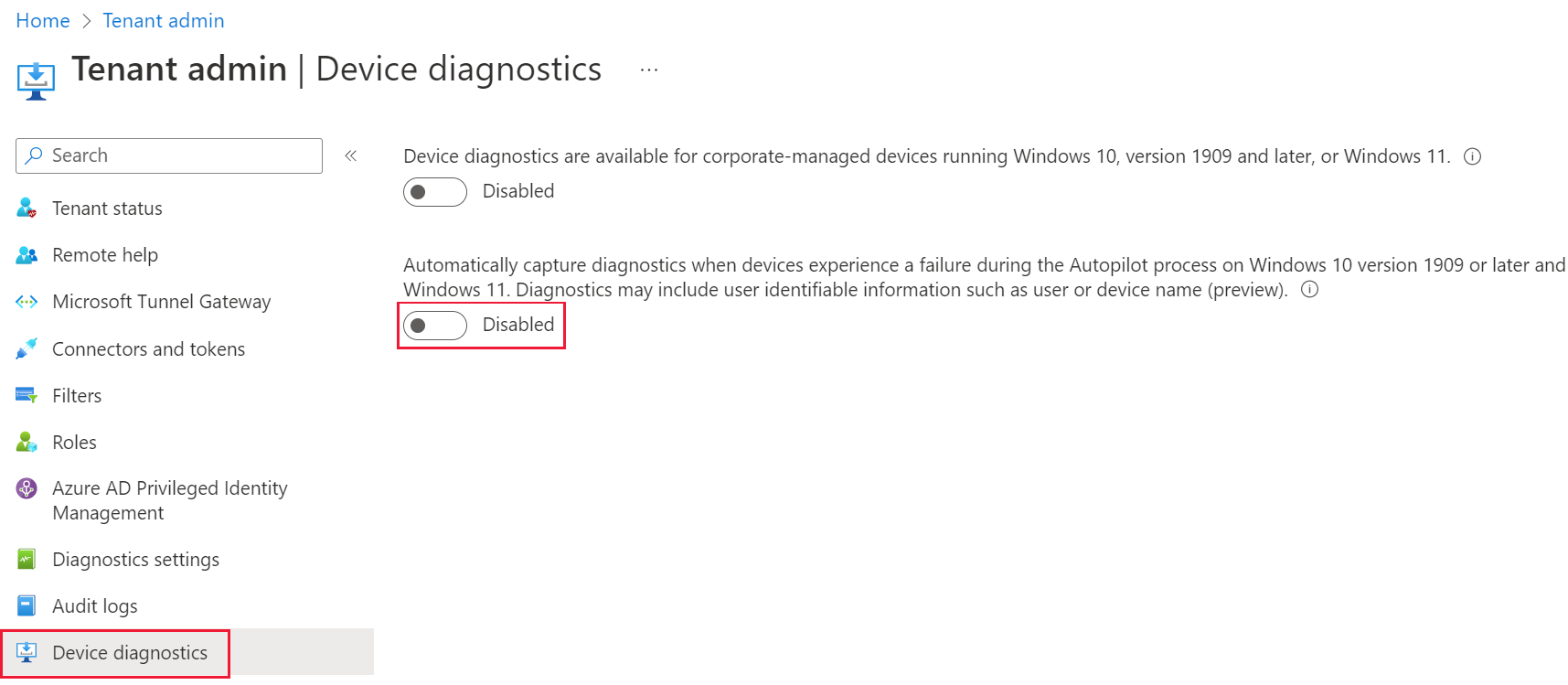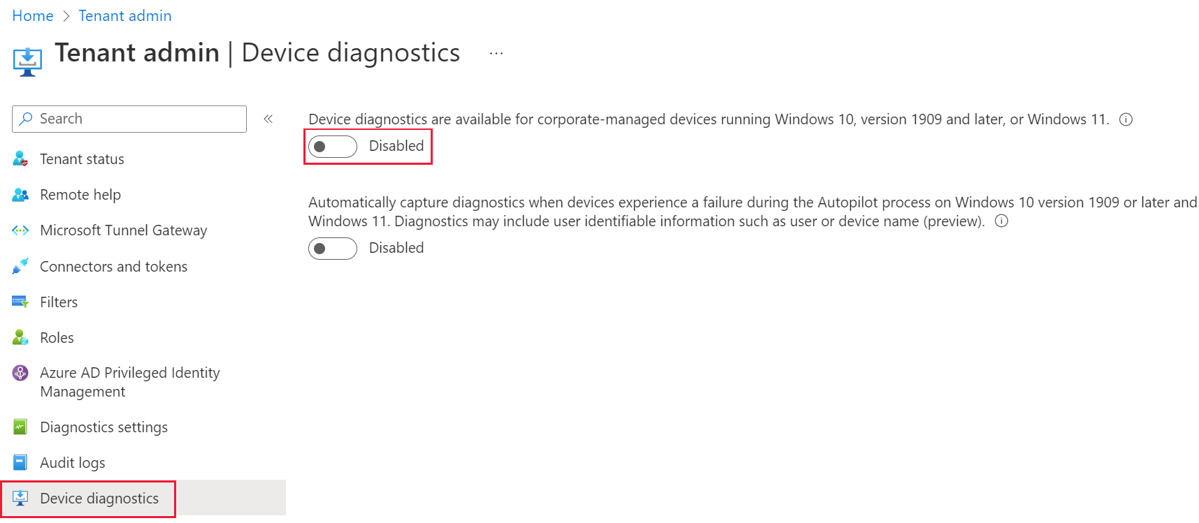 L'azione remota di raccolta diagnostica è abilitata per impostazione predefinita. È possibile disabilitare l'azione remota Raccogli diagnostica per tutti i dispositivi seguendo questa procedura: