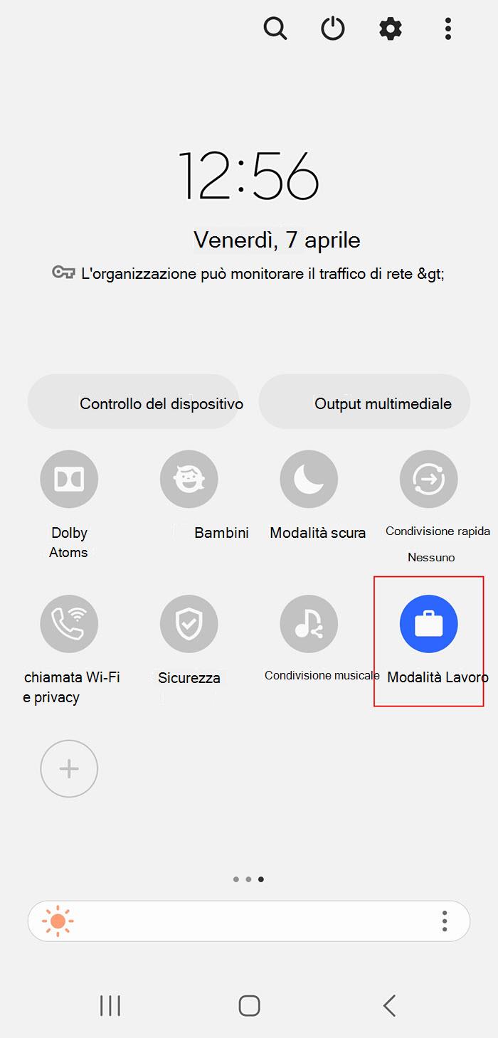 Scorrere rapidamente verso il basso sullo schermo per accedere al menu delle impostazioni rapide. Toccare profilo di lavoro per sospendere il profilo di lavoro.