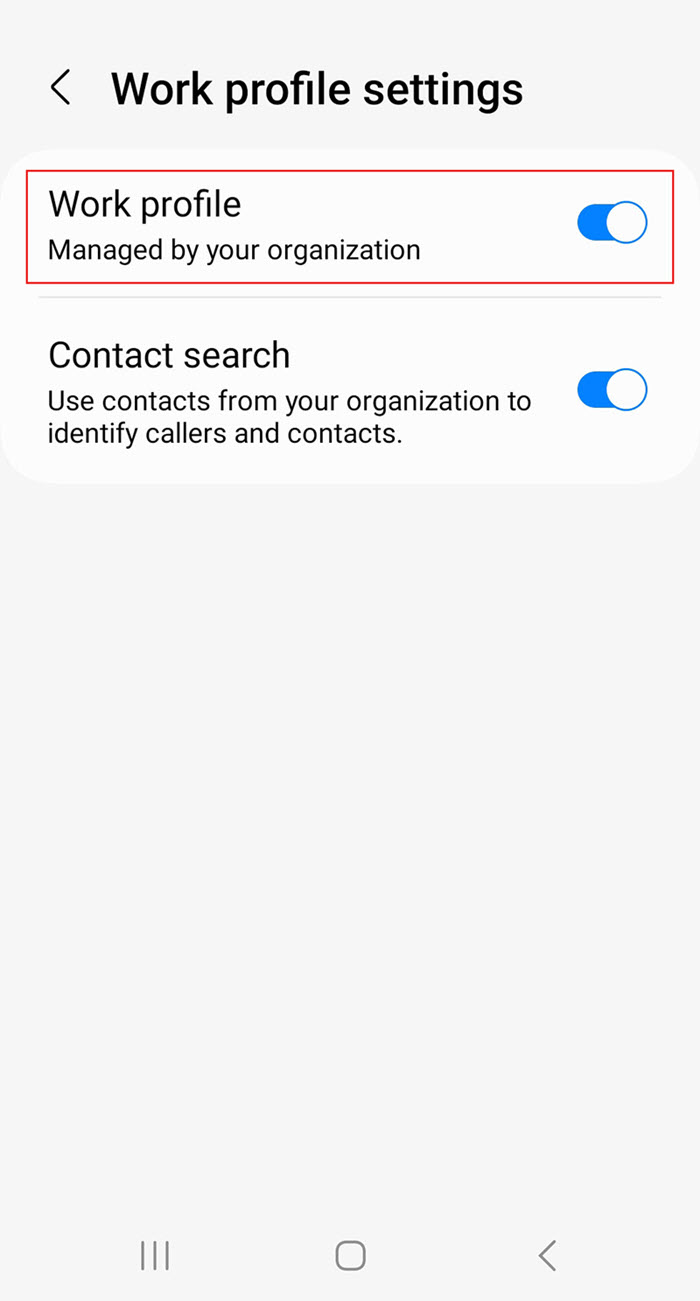 Aprire l'app Impostazioni e andare a impostazioni del profilo di lavoro. Spostare l’interruttore profilo di lavoro su disattivato.
