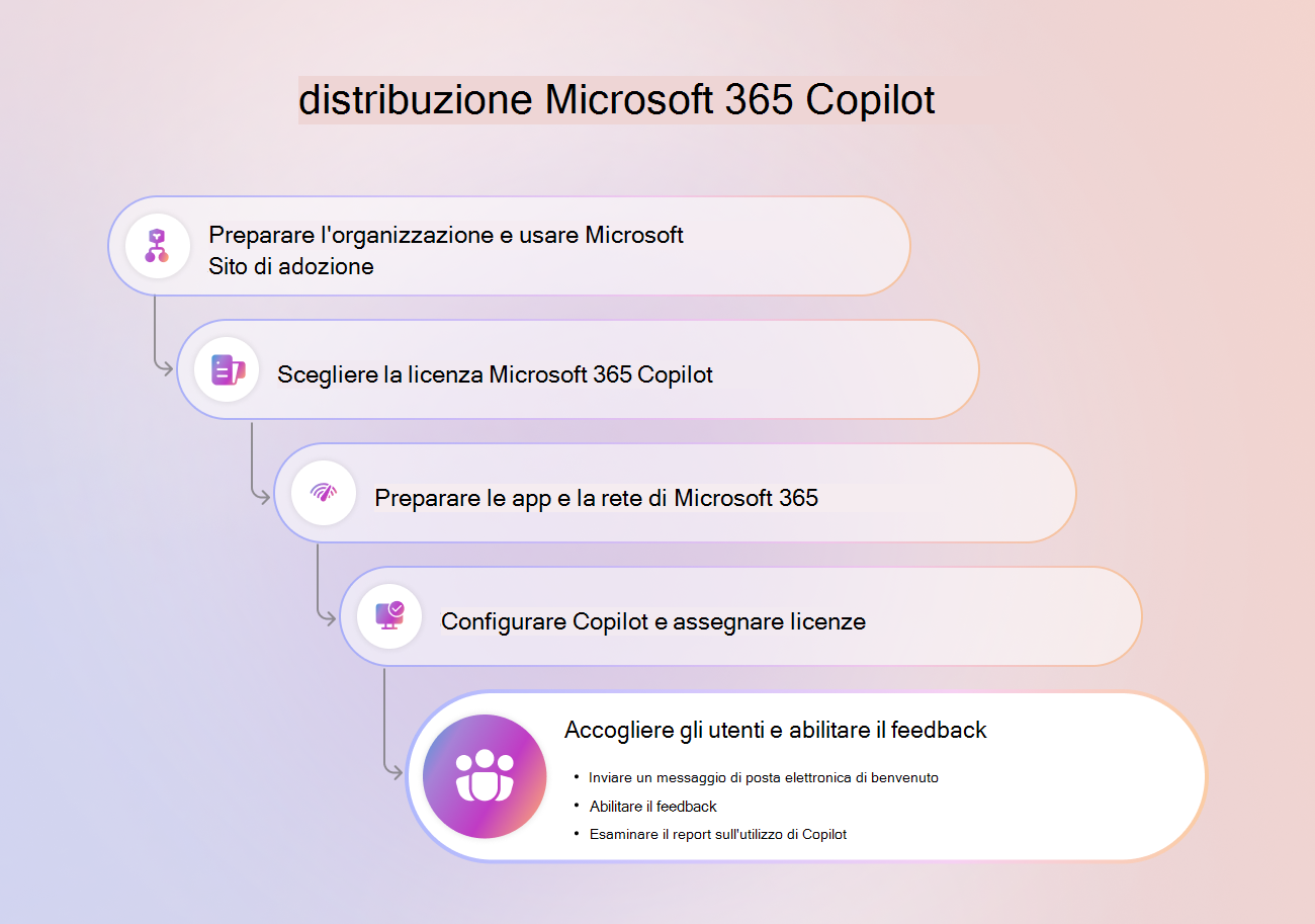 Questo articolo fornisce informazioni su come inviare agli utenti un messaggio di posta elettronica di benvenuto, abilitare il feedback, inviare messaggi dell'organizzazione ed esaminare il report sulle attività di utilizzo Microsoft 365 Copilot.