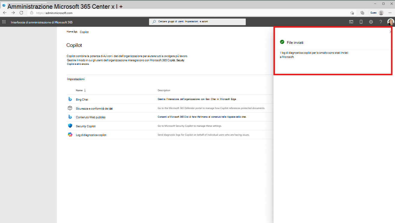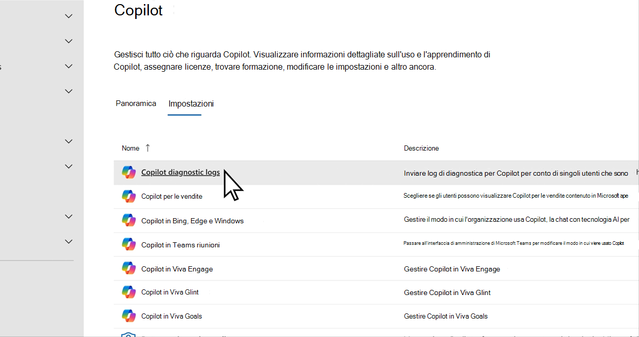 Trova Log di diagnostica di Copilot e selezionalo per aprire il riquadro dei log di diagnostica del feedback di Copilot. Esamina le informazioni e seleziona Inizia.