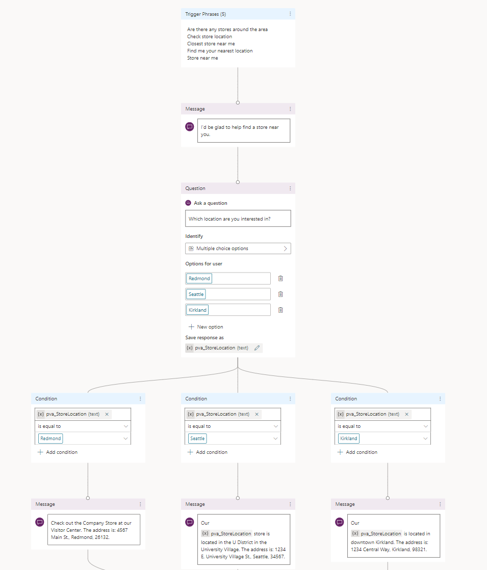 Questo argomento mostra come creare una domanda che chieda ai clienti a quale negozio sono interessati e mantenga la risposta in una variabile. In questo esempio, pva_StoreLocation è la variabile usata per memorizzare la risposta dell'utente quando si chiede la sede del negozio preferito. La condizione utilizza questa variabile per determinare gli orari del negozio da restituire.