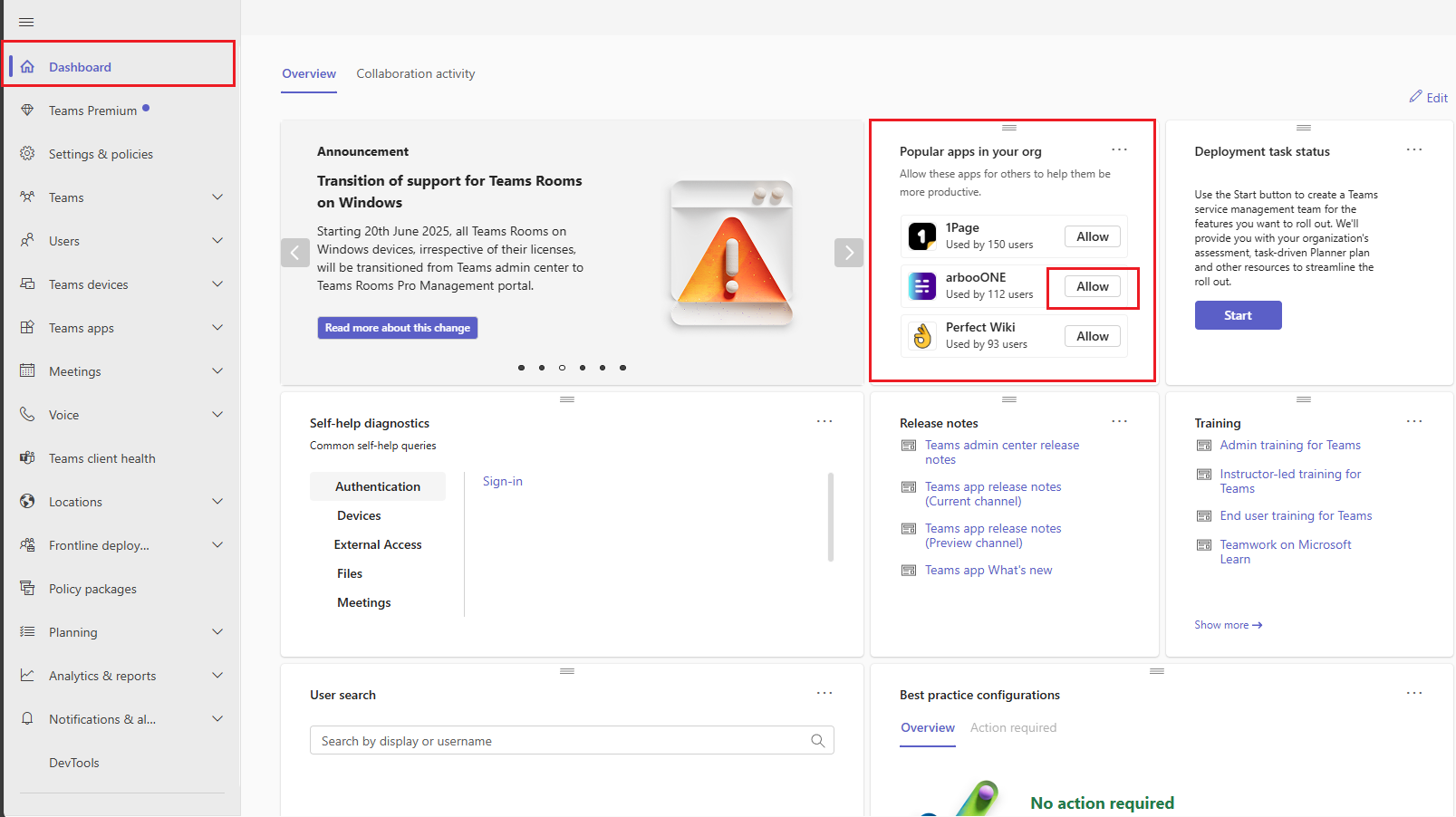 In alternativa, passare al dashboard nell'interfaccia di amministrazione di Teams per visualizzare le app popolari nel widget dell'organizzazione , che mostra tre delle app di terze parti più usate. Queste app nel widget corrispondono a quelle nella pagina Gestisci app e vengono visualizzate nello stesso ordine, ad eccezione della terza app. Selezionare Consenti per aprire la scheda Utenti e gruppi , in cui è possibile visualizzare e analizzare il numero di utenti per cui l'app è disponibile e modificare la disponibilità di conseguenza.