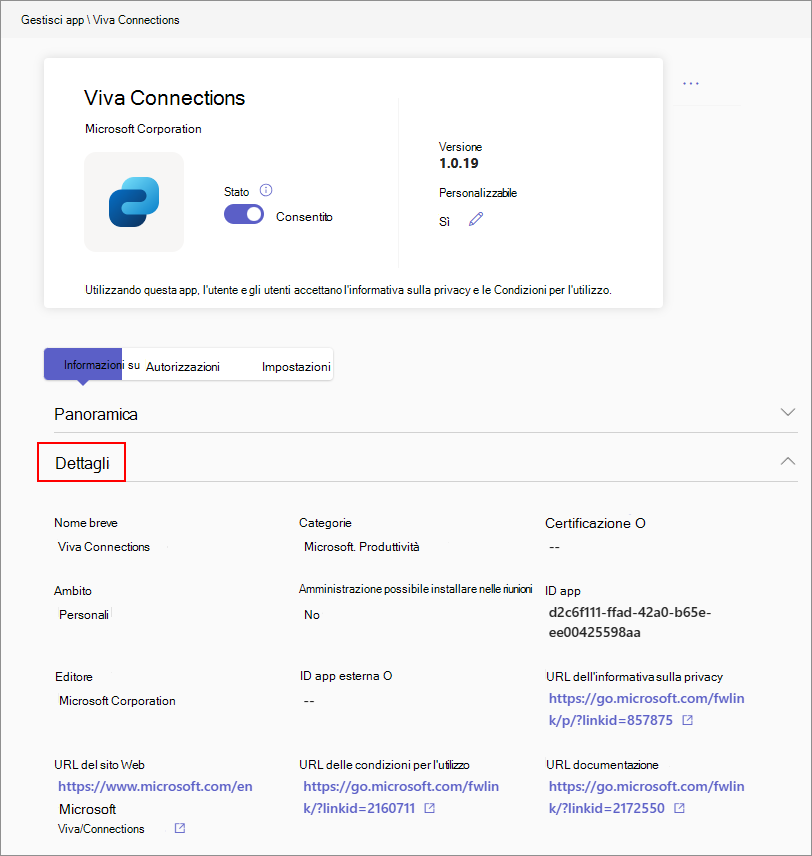 • Pagina dei dettagli dell'app nella pagina Gestisci app nell'interfaccia di amministrazione di Teams.