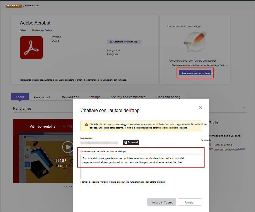 • Gli sviluppatori di app possono fornire le informazioni di contatto che puoi usare per chattare con loro. Consente di valutare rapidamente un agente o un'app e ottenere le informazioni necessarie dagli sviluppatori di app prima di adottarla e distribuirla. Gli esempi includono informazioni sulla conformità, certificazioni, procedure di gestione dei dati, dettagli sui prezzi per le app a pagamento e istruzioni di configurazione. È possibile avviare una chat con gli sviluppatori di app selezionando Avvia una chat di Teams , ma solo se lo sviluppatore dell'app ha fornito le informazioni di contatto. È consigliabile non condividere informazioni personali e sensibili nella chat Screenshot che mostra l'opzione nella pagina dei dettagli dell'app che consente di chattare con gli sviluppatori di app.