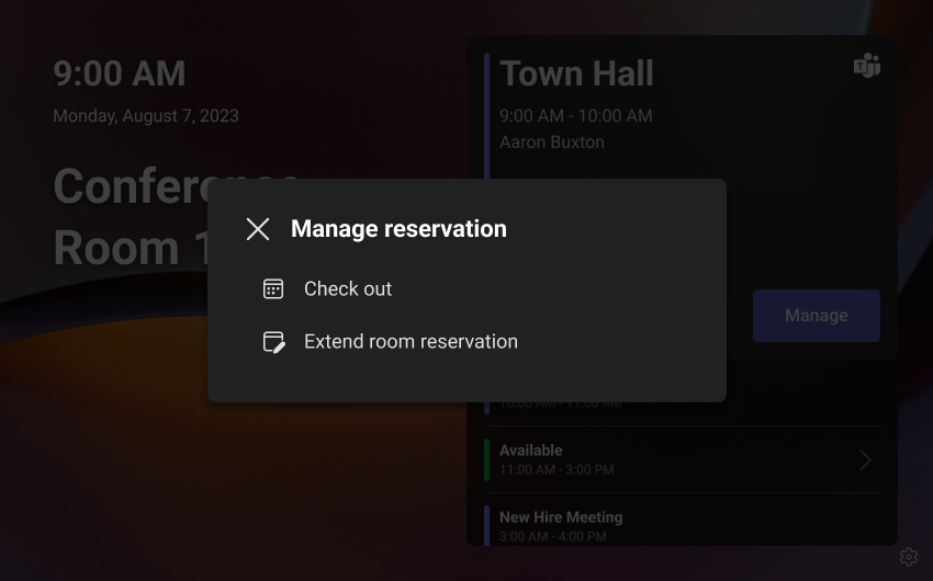 Con i pannelli di Teams, gli utenti possono apportare modifiche in tempo reale alle loro prenotazioni. Possono rilasciare la camera in anticipo dalla prenotazione o estendere la prenotazione della camera direttamente da un Pannello di Teams.
