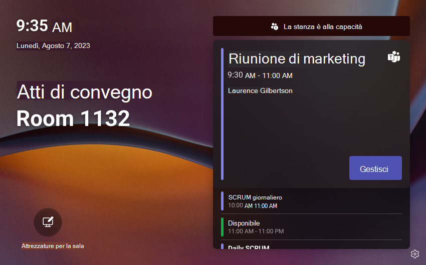 Gli utenti possono essere informati su ciò che accade all'interno della chat room senza interrompere l'esecuzione. I pannelli di Teams mostrano se la sala è attualmente in uso, se è piena e quali attrezzature della sala sono disponibili. Può anche avvisare le persone all'interno della stanza che qualcuno sta aspettando la stanza.