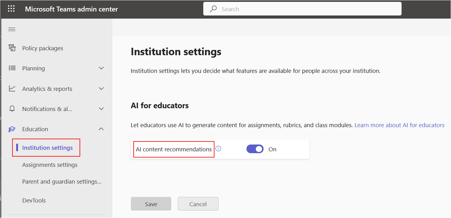 Screenshot che mostra l'impostazione per gli amministratori per abilitare o disabilitare i suggerimenti di intelligenza artificiale per il contenuto di un istituto di istruzione.