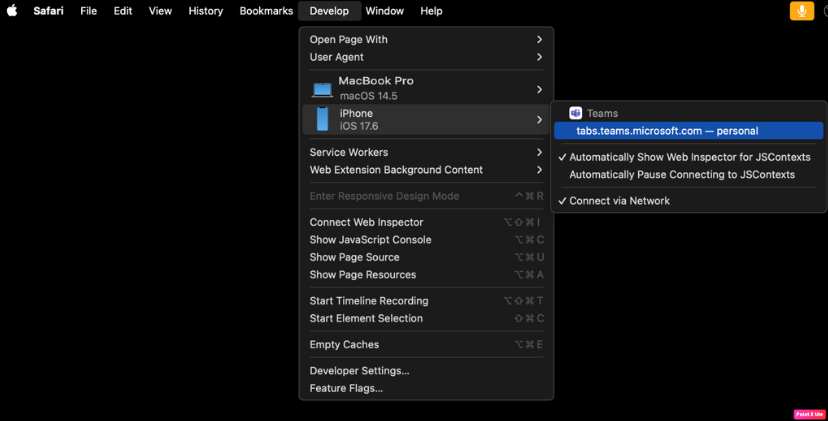 The screenshot displays the link for using Safari for development or inspection of any app used on the connected Teams iOS client.