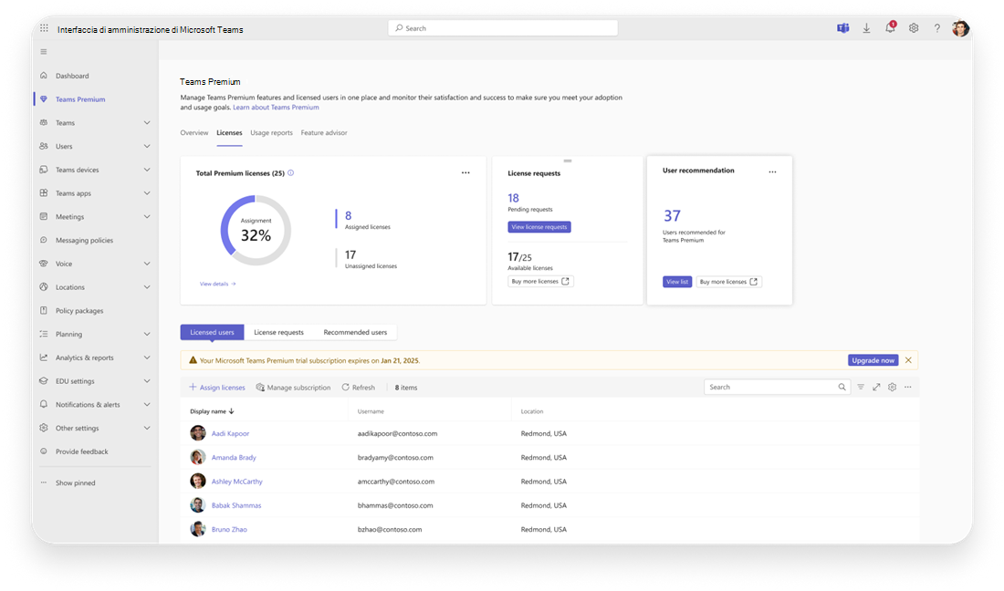 Licenze: consente di gestire e assegnare Teams Premium licenze e richieste di licenza per gli utenti dell'organizzazione. È anche possibile visualizzare un elenco di utenti con licenza e utenti consigliati di avere una licenza di Teams Premium.