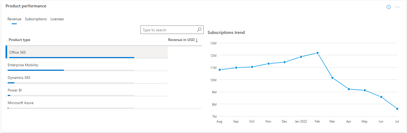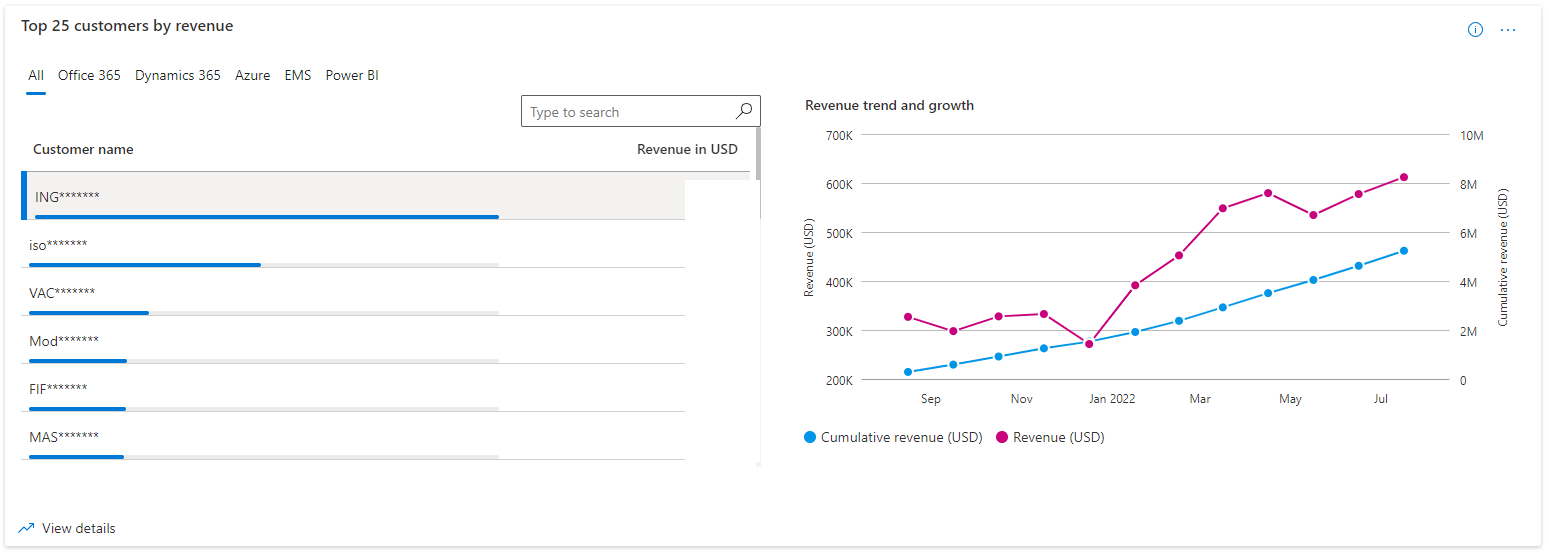 Tendenza dei ricavi per i primi 25 clienti durante l'intervallo di date selezionato. L'asse X rappresenta i mesi dell'intervallo di date selezionato e l'asse Y rappresenta i ricavi per il cliente selezionato. È possibile scegliere uno qualsiasi dei prodotti nelle famiglie di prodotti, ad esempio Office 365, Dynamics 365, Azure, EMS o Power BI.