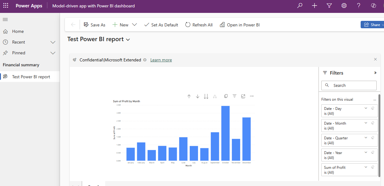 - Seleziona la pagina Power BI Embedded per eseguire azioni, ad esempio espandi, copia come immagine e filtra.