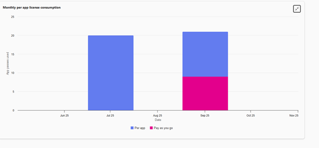 La web part Consumo mensile per licenza per app visualizza le tendenze di consumo per le licenze per app. Il grafico mostra il numero di licenze per app usate e il numero di utilizzi delle app fatturati secondo il modello pay-as-you-go ogni mese. L'app gestisce le reimpostazioni del consumo alla fine del mese.