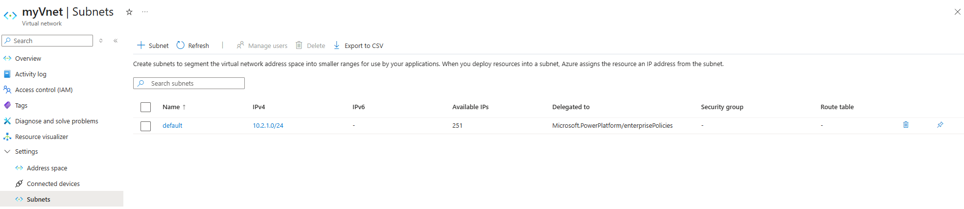 Usare una subnet esistente o creare una nuova subnet e delegarla Microsoft.PowerPlatform/enterprisePolicies. Per altre informazioni, vedere Aggiungere o rimuovere una delega di subnet.